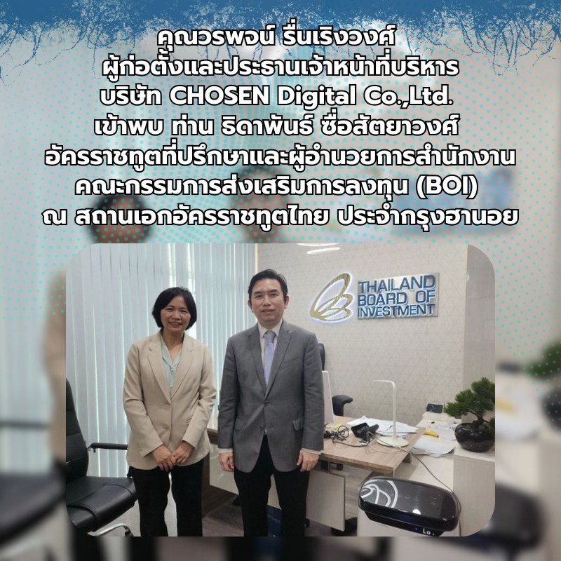 คุณวรพจน์ รื่นเริงวงศ์ ผู้ก่อตั้งและประธานเจ้าหน้าที่บริหาร บริษัท CHOSEN Digital Co.,Ltd. เข้าพบ ท่าน ธิดาพันธ์ ซื่อสัตยาวงศ์ อัครราชทูตที่ปรึกษาและผู้อำนวยการสำนักงานคณะกรรมการส่งเสริมการลงทุน (BOI) ณ สถานเอกอัครราชทูตไทย ประจำกรุงฮานอย
