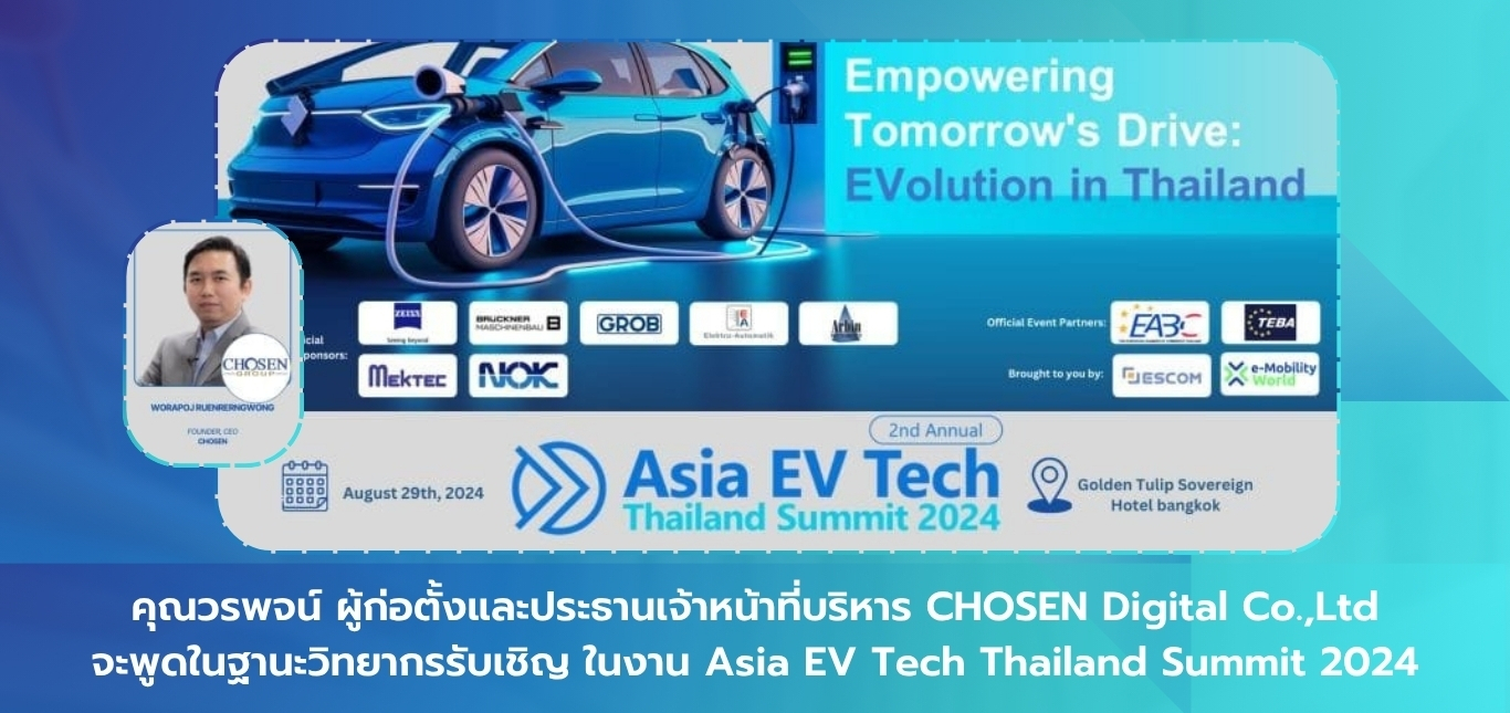 คุณวรพจน์ ผู้ก่อตั้งและประธานเจ้าหน้าที่บริหาร CHOSEN Digital Co.,Ltd จะพูดในฐานะวิทยากรรับเชิญ ในงาน Asia EV Tech Thailand Summit 2024