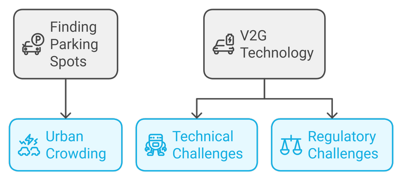 Finding parking spots with access to charging stations can be challenging in crowded urban areas. Moreover, while vehicle-to-grid (V2G) technology holds promise for enhancing energy efficiency, there are significant technical and regulatory challenges that must be addressed before it can be widely implemented.